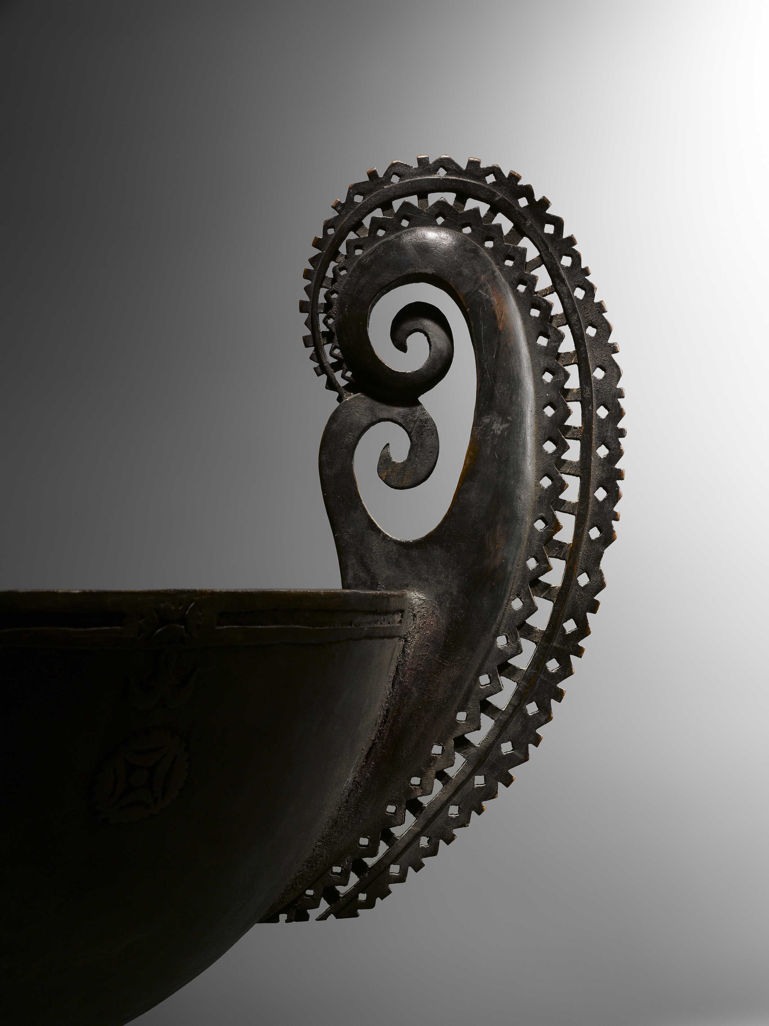 Détail d’une anse d’une coupe cérémonielle, îles de l’Amirauté. Bois et pâte de noix de parinarium. L. : 114 cm.