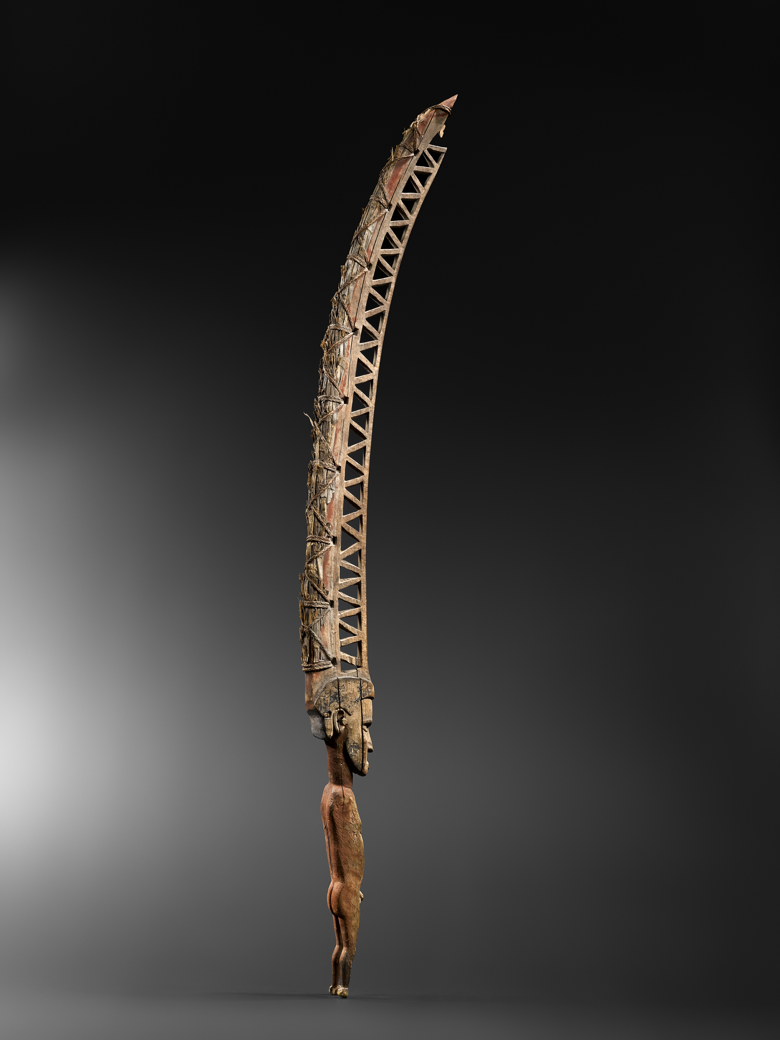 Découverte en 1616, la Nouvelle-Irlande, étroite et très montagneuse, s’étire au nord de la Nouvelle-Bretagne. Dans la moitié nord de l’île, différents groupes exécutaient autrefois des cérémonies de clôture des rites funéraires qui mettaient en scène des sculptures en bois polychrome d’une rare puissance expressive. Ces objets surprennent par la liberté apportée à l’assemblage de motifs subtilement intriqués se combinant à l’infini, suivant des règles strictes, dictées par l’organisation des rituels au cours desquels ils étaient utilisés. A ces cérémonies funéraires se mêlaient des rites liés aux grandes étapes de la vie d’un individu (naissance et initiation), mais également des rites de fertilité.
