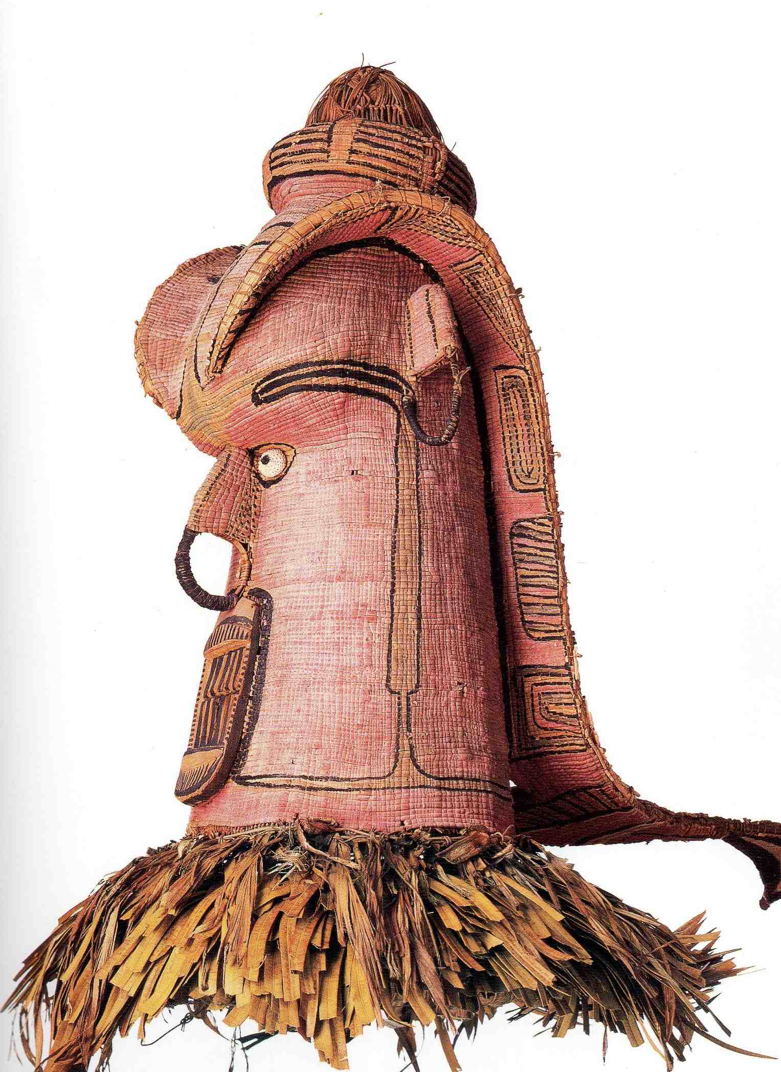 La première est connue pour ses figurines d’initiation en calcaire et ses accessoires de danse en bois, généralement ajourés, et la seconde pour ses remarquables masques-coiffes de danse coniques en étoffe d’écorce battue colorée, feuillages et plumes.