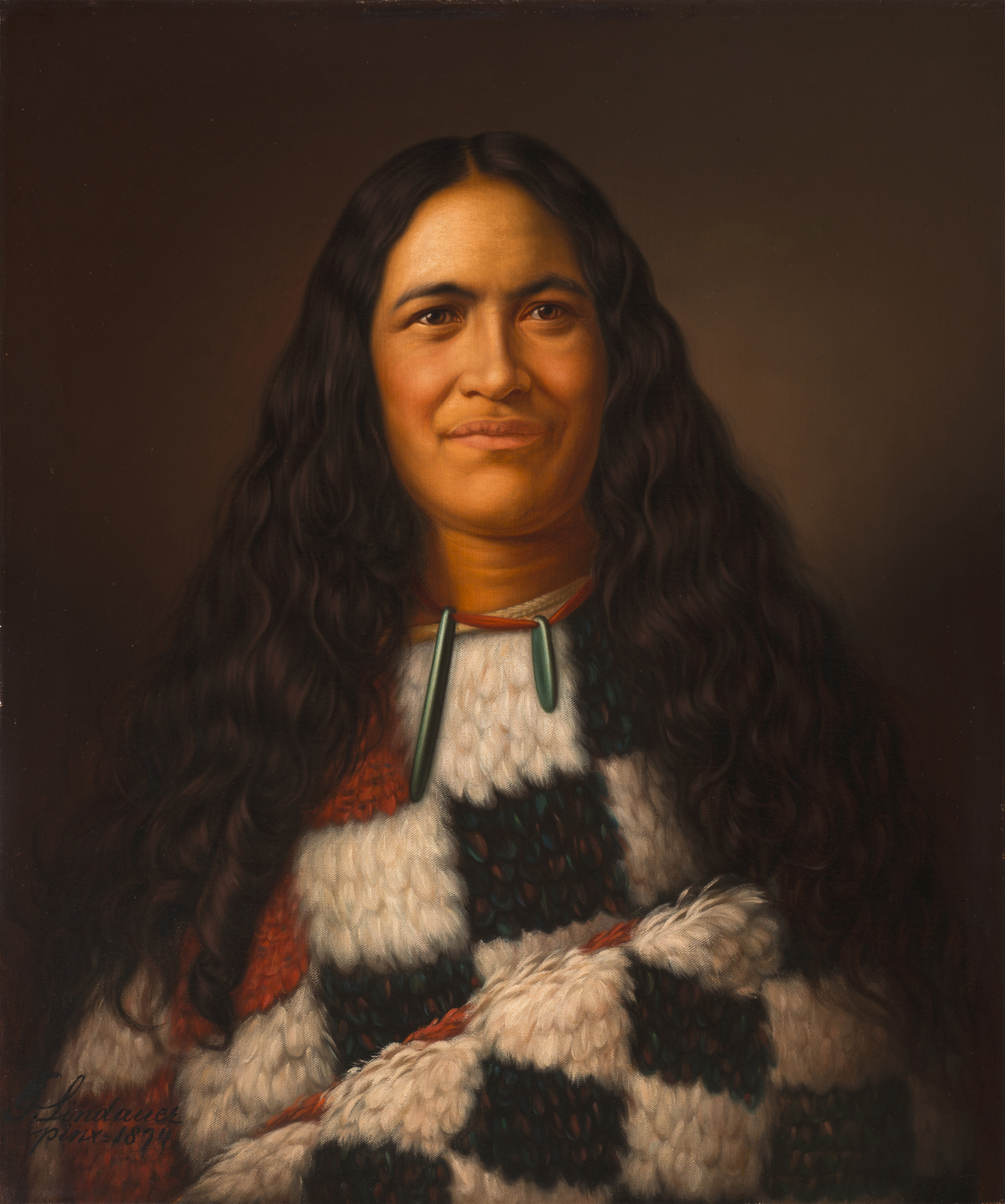 Descendant d’une des familles aînées des iwi Ngāti Apa et Ngāti Raukawa de la côte ouest de la partie basse de l’île du Nord, Te Rangi Pikinga (vers 1800- ?) n’était qu’une jeune femme lorsque les territoires de son iwi furent envahis, en 1819, par les iwi du Nord, alliés sous la conduite du redoutable Te Rauparaha (?-1849) de Ngāti Toa. Armés de mousquets, les forces du Nord attaquèrent Ngāti Awa à Turakina, tuant près de deux cents belligérants, en faisant un certain nombre de prisonniers, dont Te Rangi Pikinga. Par la suite, le neveux de Te Rauparaha, Te Rangihaeata (?-1855), épousa Pikinga, établissant ainsi une alliance entre les deux iwi. Représentée sous les traits d’une personne âgée, Pikinga porte deux larges heitiki suspendus à son cou à l’aide d’un cordon torsadé en fibres de lin. Ces deux importants taonga témoignent de son statut et figurent également sur la photo à partir de laquelle Lindauer réalisa ce portrait. Sur cette image, œuvre d’un photographe inconnu, elle est assise, enveloppée d’un manteau finement tissé orné du motif géométrique tāniko alors que, sur ce portrait, elle porte un manteau korowai hukahuka dont le décolleté est frangé de pennes de plumes noir de hukahuka. Par ses atours et ses moko kauae (tatouage du menton) et ngutu pūrua (tatouage complet des lèvres), Pikinga est clairement identifiée comme une femme de haut rang au prestige considérable.