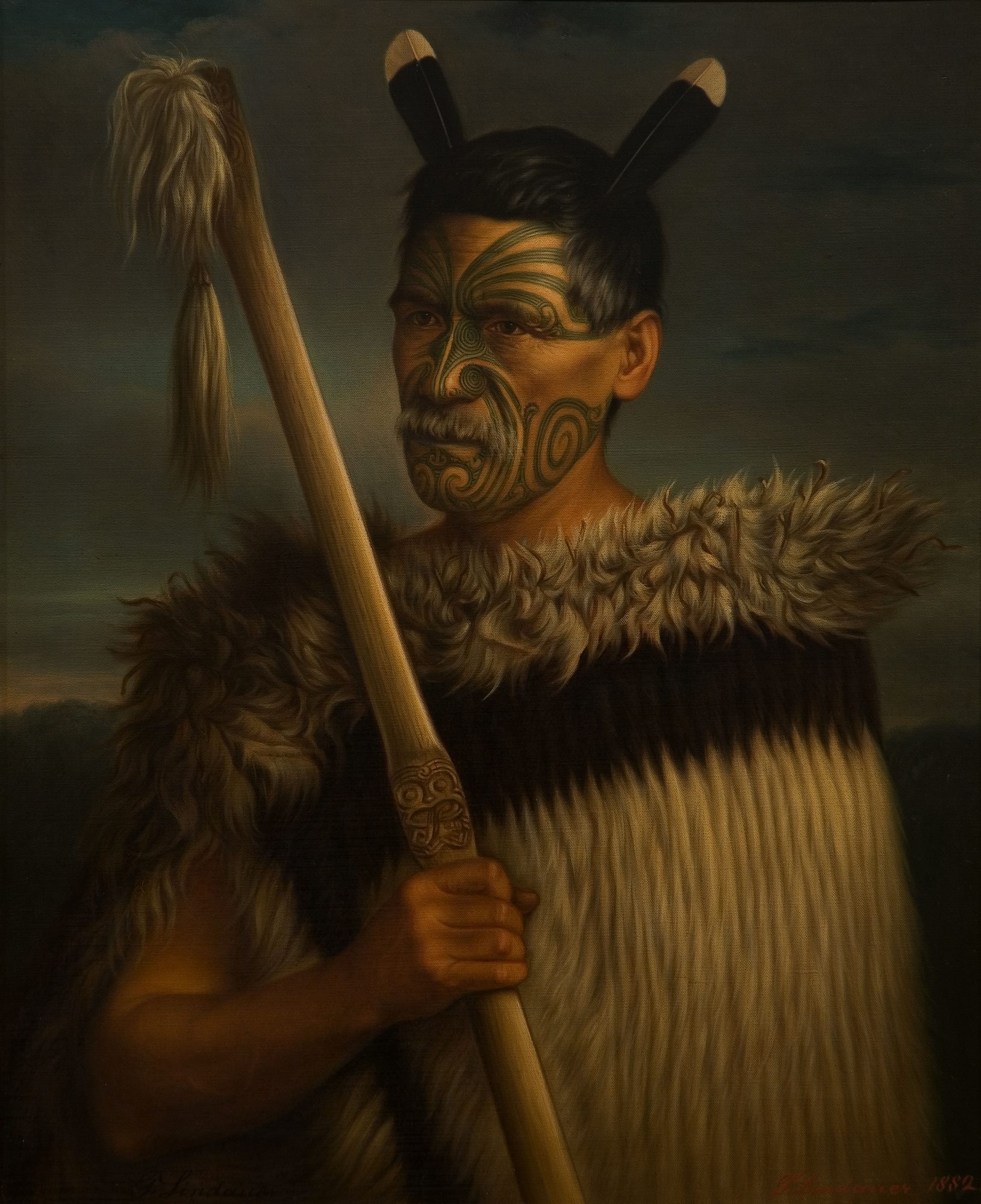 ![Gottfried Lindauer, « Kewene Te Haho [?-1902] ». Huile sur toile, non datée, 85 x 70 cm. Auckland Art Gallery Toi o Tāmaki, don de H. E. Partridge, 1915. Réf. : 1915/2/17. D’après le journal « West Coast Times », Kewene Te Haho serait mort à près de quatre-vingt-dix ans, dans sa maison, à Te Makaka, un avant-poste presbytérien, dans le port d’Aotea. Il participa à la bataille de Taumatawiwi, en 1830, où s’affrontèrent Te Waharoa de Tainui et l’iwi Ngāti Maru d’Hauraki. Membre de la Wesleyan Congregation, en tant que prédicateur, il lutta contre les méfaits de l’alcoolisme. Il tient dans sa main droite un large mere en bois orné d’une figure tipuna (ancêtre).](https://philippebourgoinarttribal.com/wp-content/uploads/2015/03/kewene-te-haho.jpg?w=246&h=300)