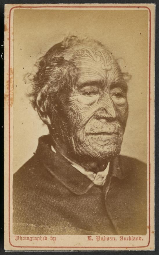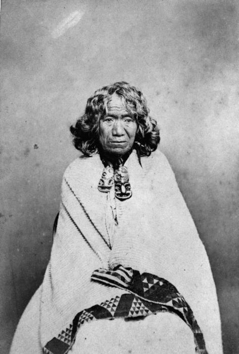 « Tāmati Waka Nene, chef de l’iwi Ngāpuhi ». Photo-carte par Elizabeth Pulman, Auckland. Cette photographie a probablement était prise peu avant sa mort, en 1871. © Alexander Turnbull Library, National Library of New Zealand, Te Puna Mātauranga o Aotearoa. Réf. : PA2-1357.