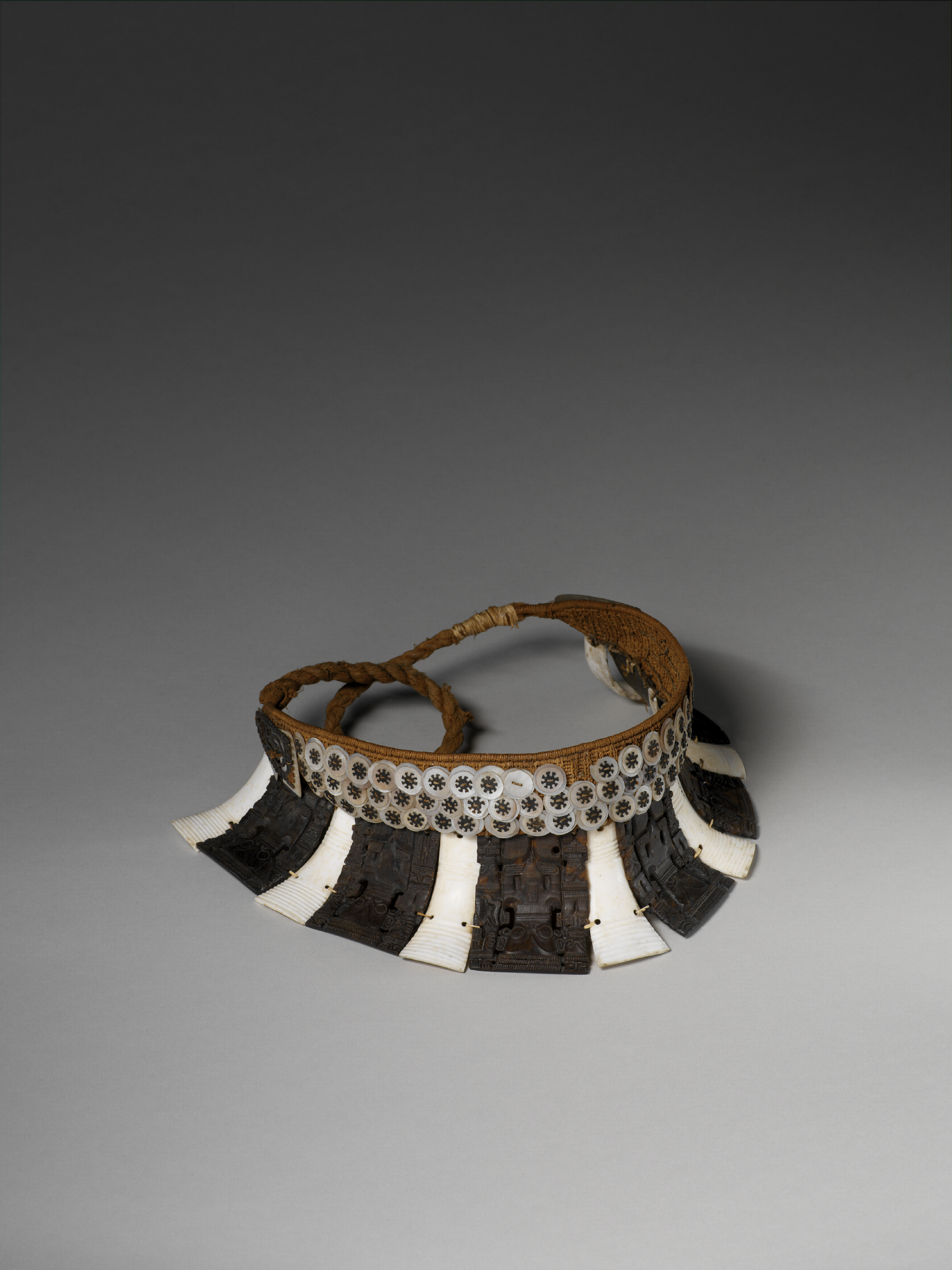 Ornement de tête uhikana, îles Marquises, fin du XIXe siècle. Nacre, écaille de tortue, fibres de bourre de coco tressées. Dim. : 15,2 x 45,7 cm. © The Michael C. Rockefeller Memorial Collection, Purchase, Nelson A. Rockefeller Gift, 1964. Accession Number: 1978.412.832.