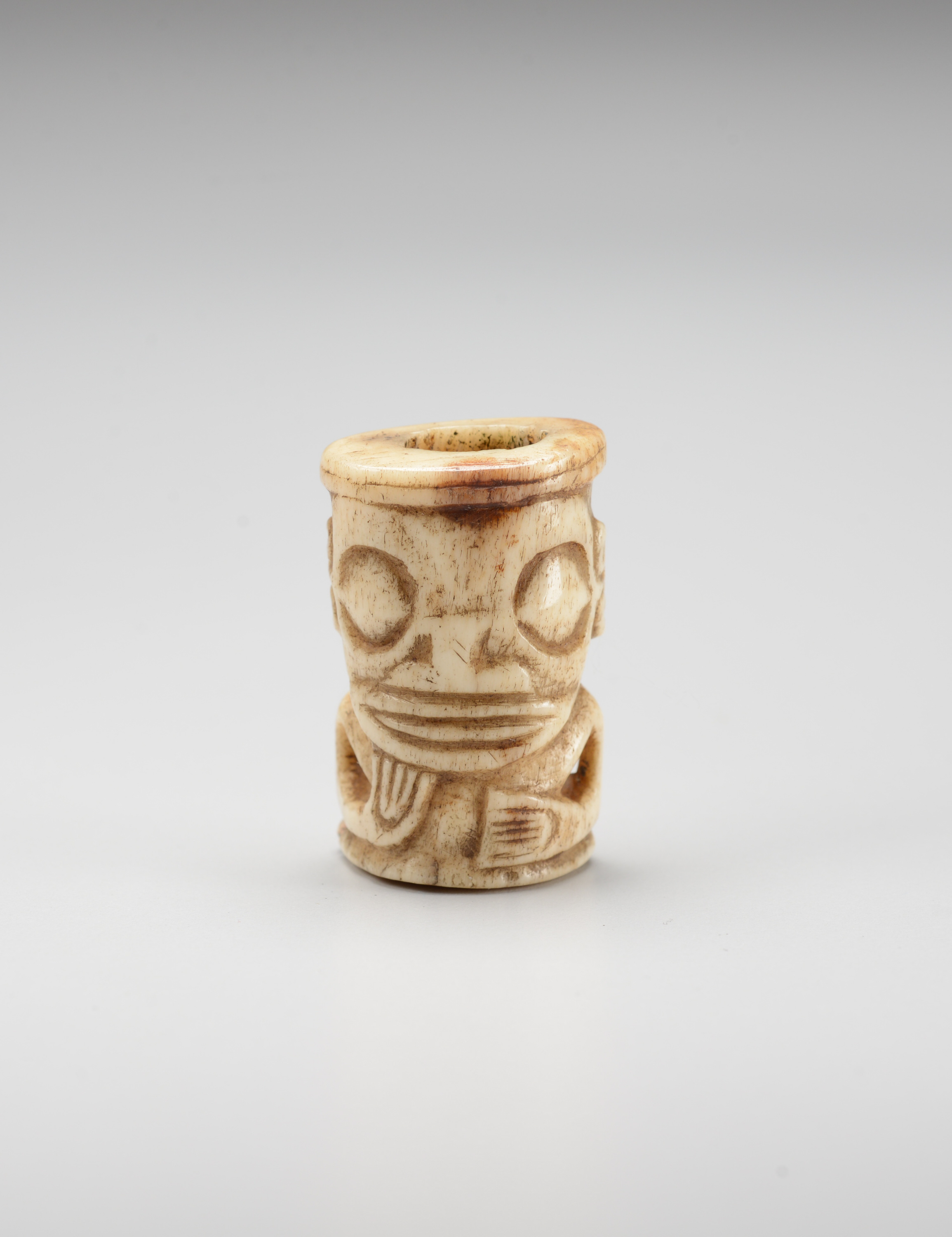 Ornement ivi poo, îles marquises, première moitié du XIXe siècle. Os humain. Dim. : 4 × 2 × 2 cm. Ex-coll. James Hooper. © Musée de Tahiti et des Îles – Te Fare Manaha, Punaauia, Tahiti, Inv. 80.08.03.