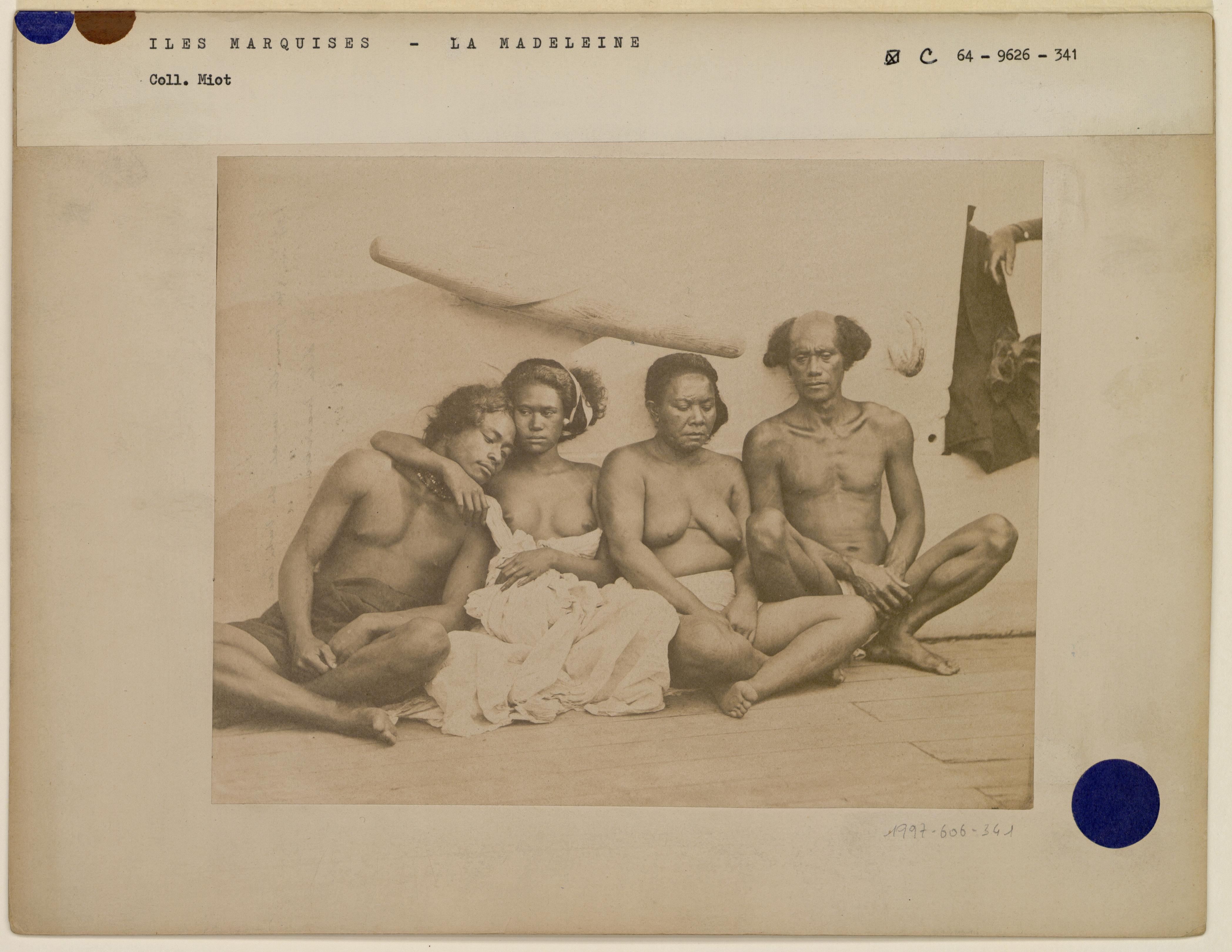 « Famille Royale de Vahitao à bord de l’Astrée », île de la Madeleine (Fatu-Hiva), îles Marquises, Paul Émile Miot, 1869. Tirage sur papier albuminé contrecollé sur carton et monté sous passe-partout. Dim. : 16 x 20,3 cm (montage : 22,5 x 29 cm). © Musée du quai Branly. Inv. PP0166452.