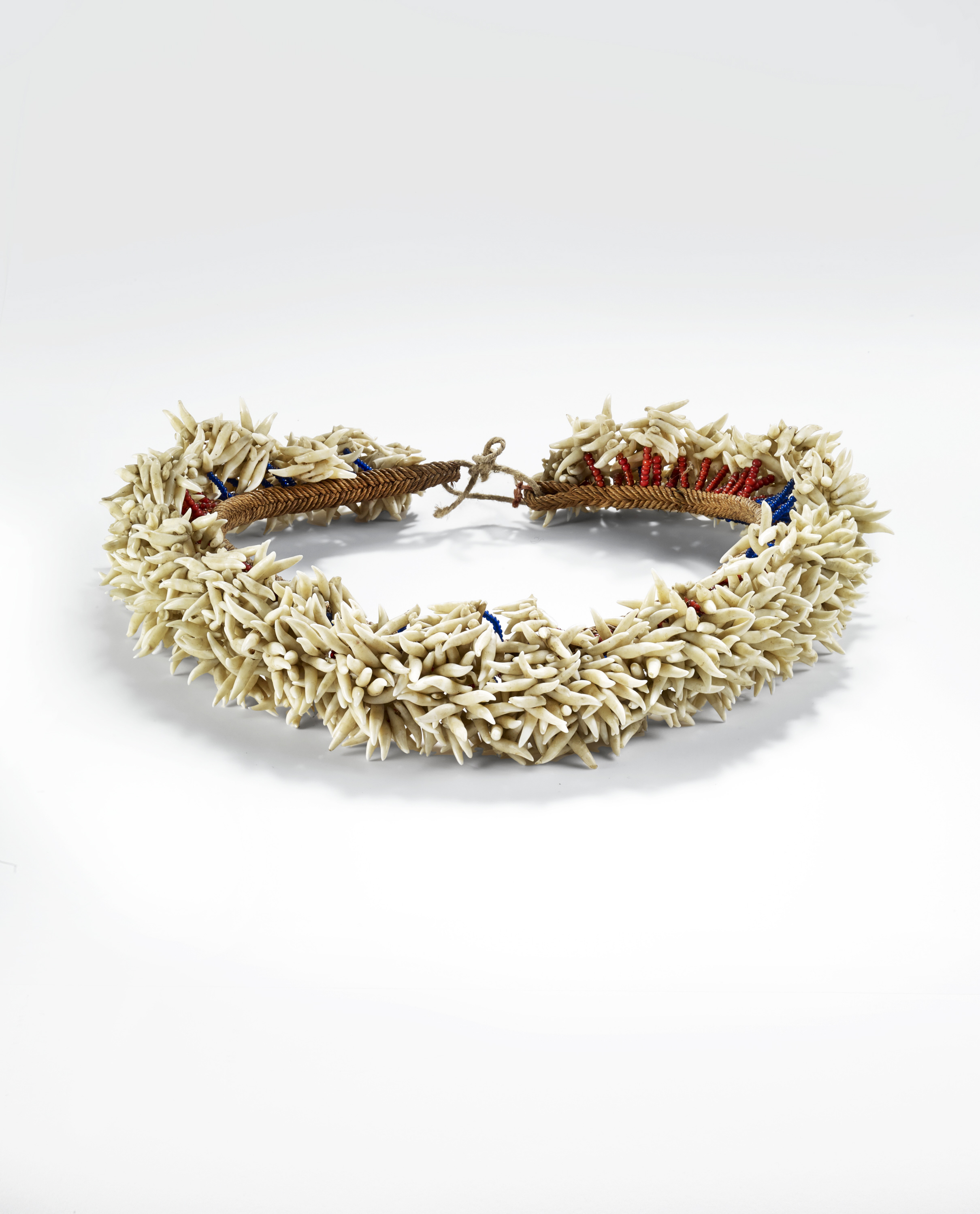 Ornement de tête pēue èi, peēue koiò, porté par les femmes, Nuku Hiva, îles Marquises. Dents de dauphin, fibres végétales et perles de verroterie. Dim. : 21 x 19,5 x 4,5 cm. Don André Michaud. © Musée du quai Branly, Inv. 71.1963.22.9. Photo : C. Germain.