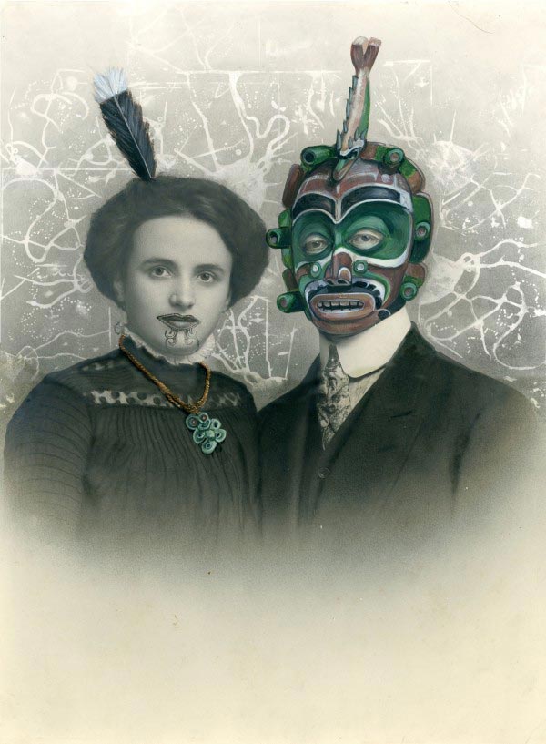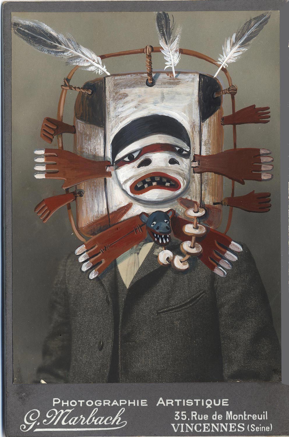 Le support principal du travail de Coco Fronsac est la photographie, de vieux clichés anonymes, datant de la fin du XIXe et de la première moitié du XXe siècle. C’est là, dans et autour de ces figures passées, qu’elle inscrit son œuvre en jouant des postures solennelles, parfois hiératiques, souvent stéréotypées, qui caractérisent ces photos prises à l’occasion d’événements structurants de la vie (naissance, communion, mariage…). Dans sa série, « Chimères et Merveilles », elle a peint sur ces portraits des masques ancestraux d’Afrique, d’Océanie, d’Asie, des Amériques et même du folklore européen, conjuguant ainsi, dans des mises en scène troublantes, des expressions artistiques radicalement différentes et pourtant contemporaines, toutes aussi normées par les traditions. Elle s’amuse visiblement de ce décalage, voire de ces oppositions entre les formes et les couleurs, qu’elle accentue à plaisir en peuplant ses compositions d’animaux étranges issus de son imaginaire onirique, de plantes tropicales, de coraux, d’extraits de planches d’anatomie… Les titres évocateurs ou insolites nous parlent aussi des influences dada et surréalistes de l’artiste.