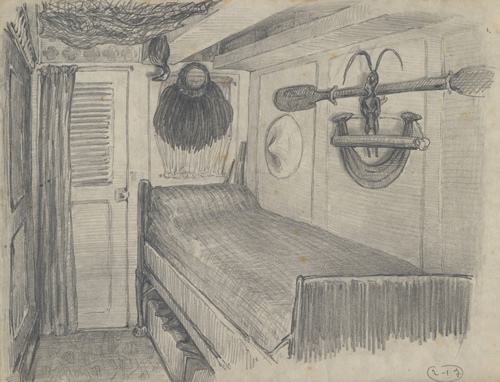 La cabine de Pierre Loti sur La Flore (côté lit). Dessin par Pierre Loti. En plus d’un moai kavakava, on y voit le reimiro, l’ao et une collerette en fibres végétales. Dessin à la mine de plomb sur papier vélin fin, 20 x 26 cm. © Muséum d’histoire naturelle de Toulouse, MHNT.ETH.OC.981.1.1. Photo D. Martin.