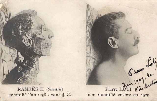 Pierre Loti, lors de son voyage en Egypte, en 1907, visite le musée du Caire et tombe en arrêt devant la momie de Ramsès II Sésostris, trouvant que le pharaon lui ressemble étrangement. On peut ainsi voir un document extraordinaire, un double portrait qu’il éditera sous la forme d’une photo-carte humoristique avec les légendes suivantes : « RAMSÈS II (Sésostris) momifié l’an 1258 avant J.C. », sous le portrait du pharaon et « Pierre LOTI non encore momifié en 1909 », sous le sien.