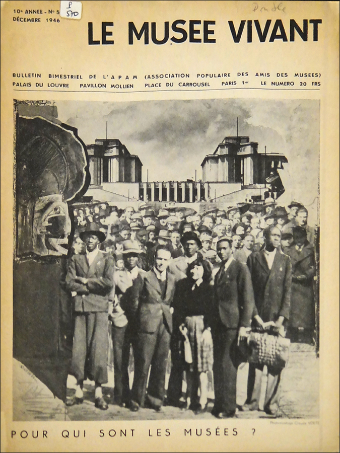 « Le Musée Vivant », 10e année, n° 5, 1946. Photomontage proposant, une foule devant le musée de l’Homme avec, au premier rang, Madeleine Rousseau entourée de plusieurs Africains et, sur la gauche, un masque océanien.