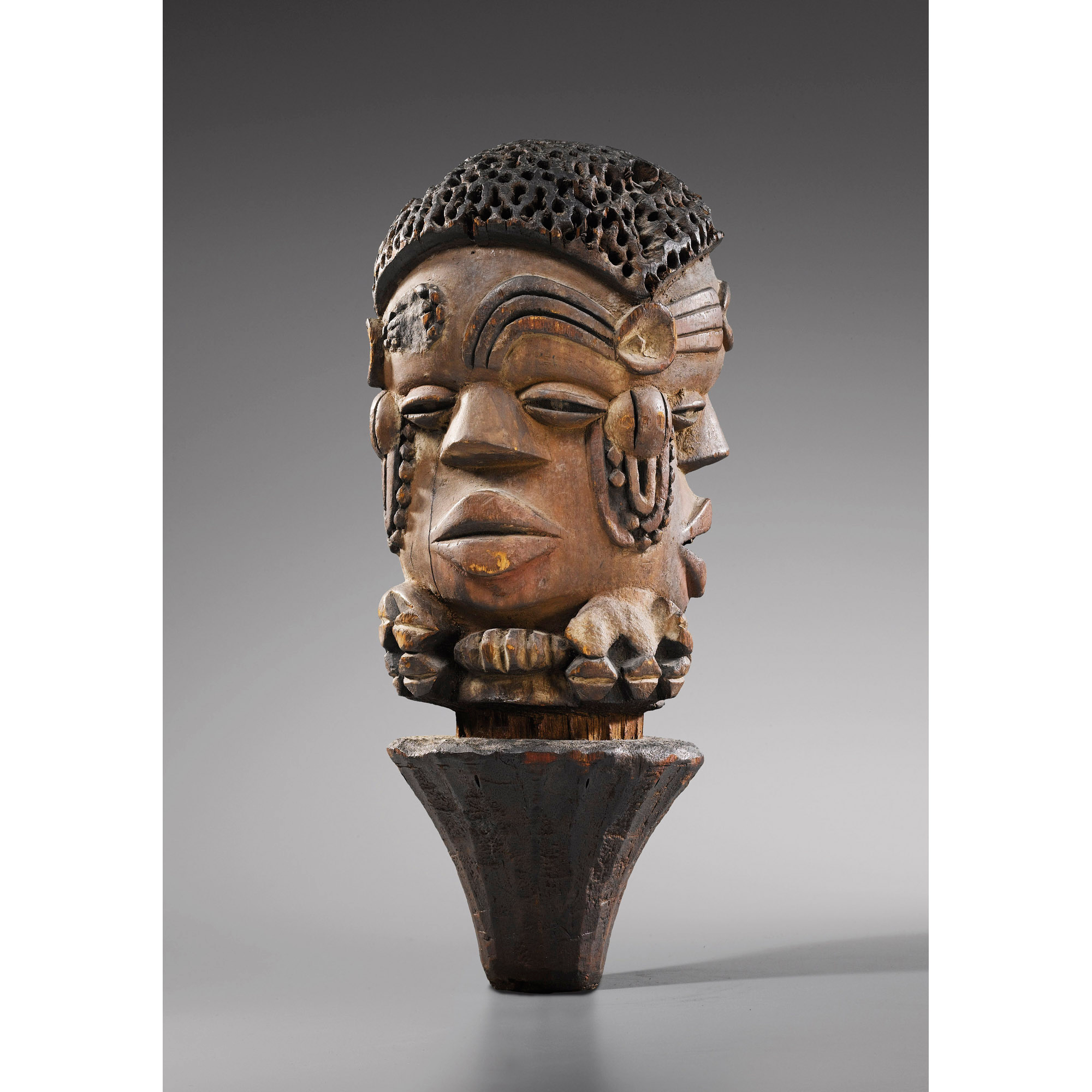 Tête à trois visages, Kuyu, République du Congo. Bois et pigments. H. : 36 cm. Collectée avant 1938 par Aristide Courtois. Ex-coll. C. Ratton ; M. Rousseau ; H. Kamer et D. Cordier. Coll. privée.
