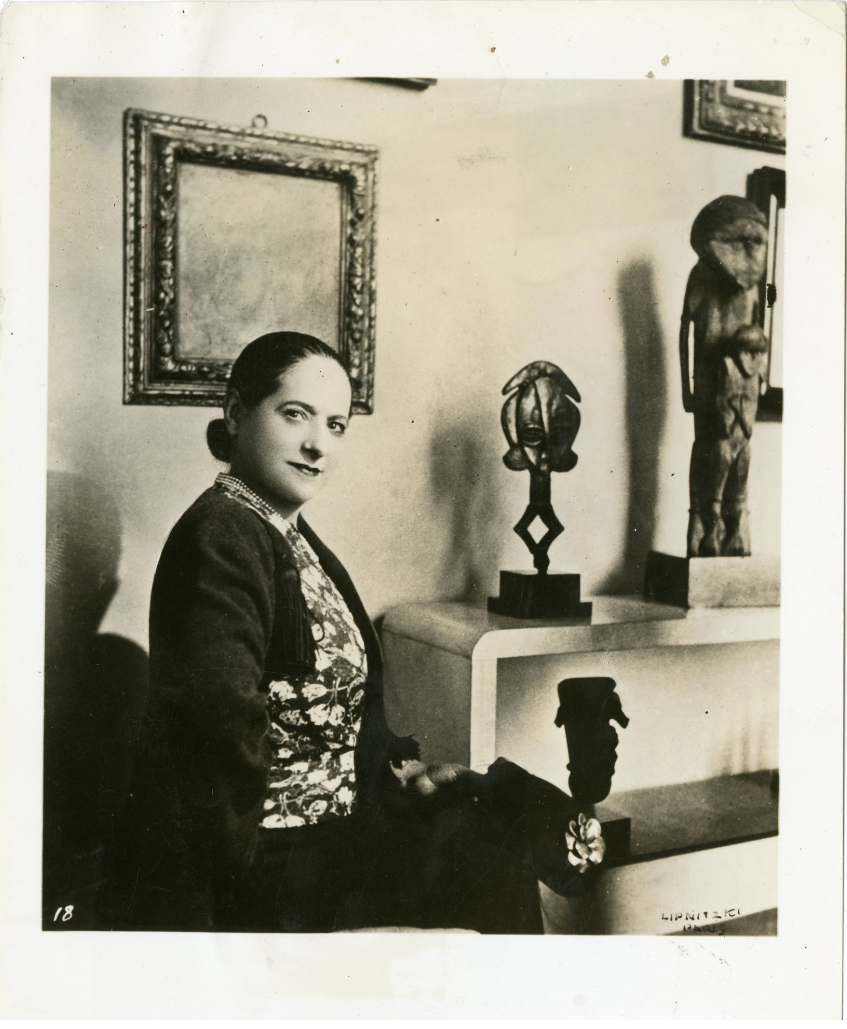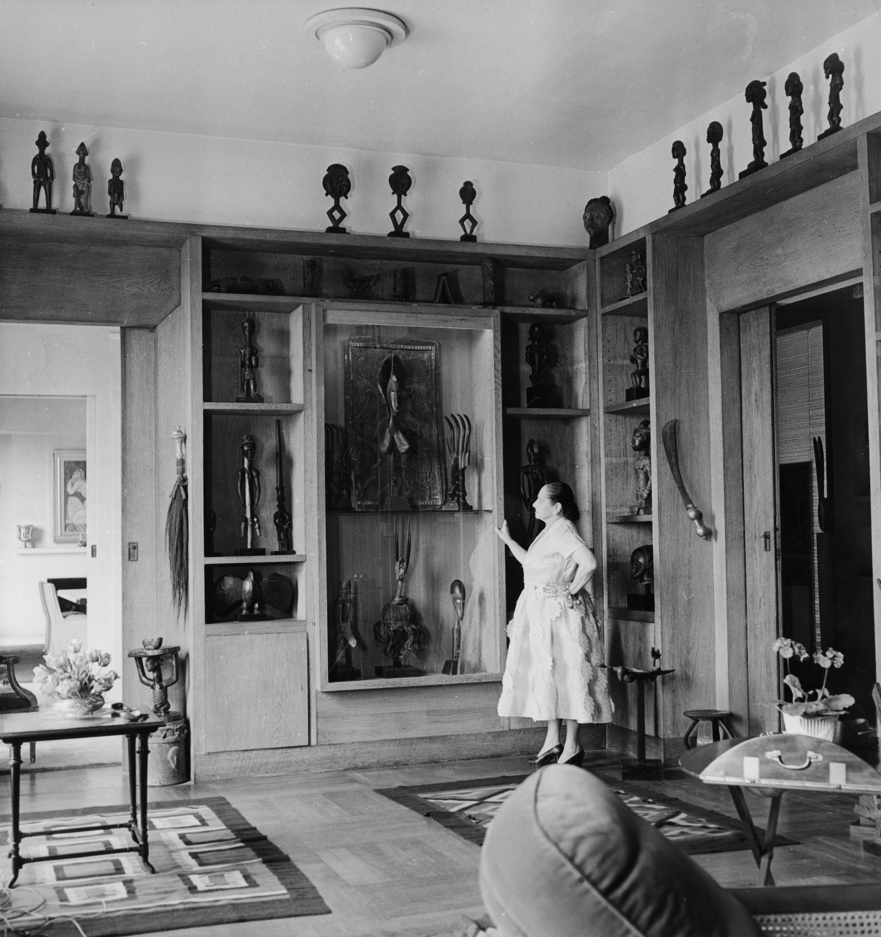 Boris Lipnitzki (1887-1971), Helena Rubinstein dans son appartement parisien du boulevard Raspail, habillée par Edward Molyneux, 1934. Sur la gauche, une figure de reliquaire kota et la sculpture sentani. © PARIS, archives de la Fondation Helena Rubinstein-L’Oréal.