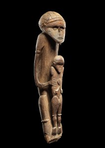 D’Océanie, la collection incluait une exceptionnelle figure provenant de la région du lac Sentani, sur la côte nord de la partie indonésienne de la Papouasie Nouvelle-Guinée, collectée par Jacques Viot (1898-1973), en 1929. Les représentations d’une mère avec son enfant étant rares dans l’art océanien, cette sculpture représenterait peut-être plutôt un individu et son ancêtre tutélaire. Les Sentani vivaient dans des villages construits sur pilotis. Jusqu’au début du XXe siècle, la maison du chef était la plus grande structure du village et était souvent décorée de sculptures représentant une variété de sujets. Des figurations de ce type ornaient le sommet des poteaux qui soutenaient le toit et le sol de la maison et étaient également gravés dans les pieux qui supportant les ponts de planches reliant les maisons du village.
