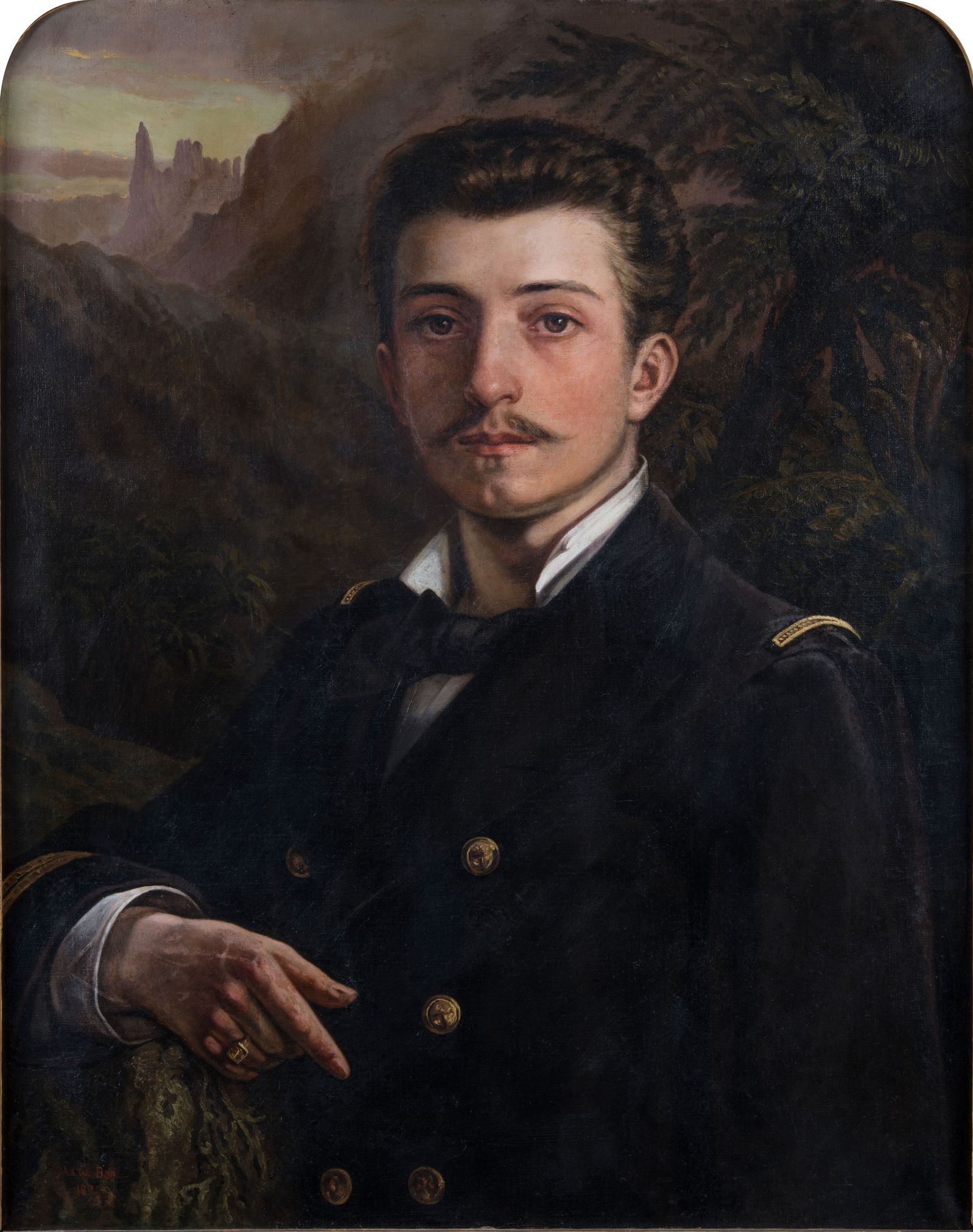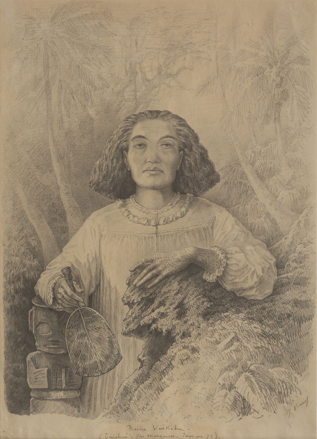 À l’âge de seize ans, Louis-Marie-Julien Viaud, dit Pierre Loti (1850-1923), alors qu’il passait une enfance austère, affirma sa volonté de devenir officier de marine et, en 1866, c’est à Paris qu’il prépara l’École navale, au Lycée Napoléon (Henri IV à partir de 1873). Reçu au concours l’année suivante, il partit sillonner les mers du globe. Succombant à son tour à la « sensualité » des îles, il allait réaliser ce que Gustave n’avait pu faire, jouant les reporters ethnologues, dessinant des idoles, des tatouages, des portraits, des scènes de genre et des paysages : « Je comprenais pour la première fois de ma vie tout le chemin déjà parcouru dans ma tête par ce projet, à peine conscient de m’en aller aussi, de m’en aller même plus loin que mon frère, et plus partout, par le monde entier (Le Roman d’un enfant, 1890, chapitre LXXV) ». Il était tout juste âgé de vingt-et-un ans lorsque, le 15 mars 1871, il s’embarqua, en tant qu’aspirant de marine, à bord du Vaudreuil, un aviso à hélice. Le 11 octobre, il arriva à Valparaiso d’où il repartit, le 19 décembre, cette fois à bord de La Flore, une frégate appartenant à la division navale du Pacifique, commandée par le contre-amiral François-Théodore de Lapelin (1812-1888). L’objectif de cette campagne était de visiter diverses îles, dont les Marquises, Tahiti et, en premier lieu, Rapa Nui, d’y effectuer des relevés hydrographiques mais aussi d’en rapporter un moai. À son arrivée en France, en 1872, la tête monumentale en tuf volcanique collectée par Lapelin fut installée au Jardin des Plantes, face à̀ l’une des entrées du Muséum d’Histoire Naturelle. Elle fut, par la suite, transférée dans le hall de l’entrée du Musée de l’Homme, ouvert en 1938, avant de trouver sa place définitive, au Musée du quai Branly. Un prélèvement probablement tout autant motivé par la science que par le désir de rivaliser avec le contre-amiral Richard Ashmore Powell (1816-1892) qui, en 1868, commandant la frégate britannique Topaze, obtint deux statues aujourd’hui conservées par le British Museum. Le 3 janvier 1872, l’expédition française arriva à proximité de cette île perdue dans l’immensité du Grand Océan. La Flore y fit escale, du 3 au 7 janvier, dans la baie de Hanga Roa. Découvrant une ancienne civilisation moribonde et une population au bord de l’extinction, Julien prit conscience de l’effet dévastateur que l’Occident pouvait avoir sur d’autres cultures. Ainsi, cette première escale le marqua profondément. Pendant les quatre jours de cette étape, encouragé par ses officiers supérieurs, il arpenta l’île en tous sens, consignant tout ce qu’il voyait, s’intéressant aux habitants, à leur quotidien, à leur histoire, à leurs coutumes et à leurs croyances disparues, ce qui lui permit de recueillir des objets. Situation particulièrement rare pour un aspirant, il disposait de sa propre chambre dans l’entrepont de la frégate, qu’il put ainsi aménager avec ses collectes. Par l’intermédiaire de sa sœur, Marie Bon (1831-1908), artiste peintre, à qui il envoyait ses dessins et ses notes, la fameuse revue L’illustration publia, sous le titre « L’île de Pâques, Journal d’un sous-officier de l’État-Major de La Flore », un grand article dans ses numéros des 17, 24 et 31 août 1872, repris dans son ouvrage Reflets sur la sombre route (1899). Des articles remarqués, considérés aujourd’hui comme de précieux témoignages ethnographiques sur les derniers moments de la culture rapa nui. L’autre contribution de Viaud à la notoriété de cette culture concerne les vestiges de son ancienne écriture, les rongorongo, ces tablettes en bois gravées de glyphes. Julien réalisa trois estampages de la tablette dénommée mamari (aujourd’hui conservée au musée de la Congrégation des Sacrés-Cœurs de Jésus et de Marie de Picpus à Rome, Inv. P003). Il releva également soigneusement quelques lignes de ces caractères étranges, assorties d’interprétations fournies par Mgr Florentin-Étienne dit Tépano Jaussen (1815-1891), premier vicaire apostolique de Tahiti qui se passionnait pour ces tablettes. Du 19 au 24 janvier, ce fut une escale aux îles Marquises. Après la rudesse de l’île de Pâques, Viaud rencontra, dans cet archipel, la magnificence de paysages luxuriants. Le navire jeta l’ancre dans l’île de Nuku Hiva et quitta le mouillage cinq jours plus tard. Il rencontra la reine Vaekehu (vers 1825-1901) dont il réalisa le portrait et s’appliqua à relever les motifs des tatouages qui ornaient ses mains et ses pieds. Il réussit également à acquérir quelques objets. Le 29 janvier 1872, La Flore jeta l’ancre au large de Papeete et reprit la mer le 23 mars, avant de faire une nouvelle escale dans l’île fin juin début juillet de la même année. Viaud fut enchanté par ce pays où, dix ans auparavant, vécut son frère Gustave. Dans les pas de ce dernier, et bien que sa quête fut décevante, elle devint la matière première de l’un de ses romans les plus fameux : Le Mariage de Loti (1880).À Papeete, Julien fréquenta à son tour la cour de la reine Pōmaré IV, dont il dessina le portrait. C’est là que les suivantes de la reine le baptisèrent « Loti » (fleur tropicale rose proche du laurier), nom qu’il adoptera comme pseudonyme littéraire. En 1881, Loti fut promu lieutenant de vaisseau et publia son premier roman officiellement signé « Pierre Loti » : Le Roman d’un spahi. Découvrant ensuite la Bretagne, il s’en inspira pour écrire ses ouvrages les plus célèbres : Mon Frère Yves (1883) et Pêcheurs d’Islande (1886). En 1886, de retour en France, Loti se maria avec Blanche Franc de Ferrière (1859-1940). En 1890, il publia Le Roman d’un Enfant, roman dans lequel il se rappelle une enfance solitaire et triste. Ses ouvrages lui valurent une immense popularité et