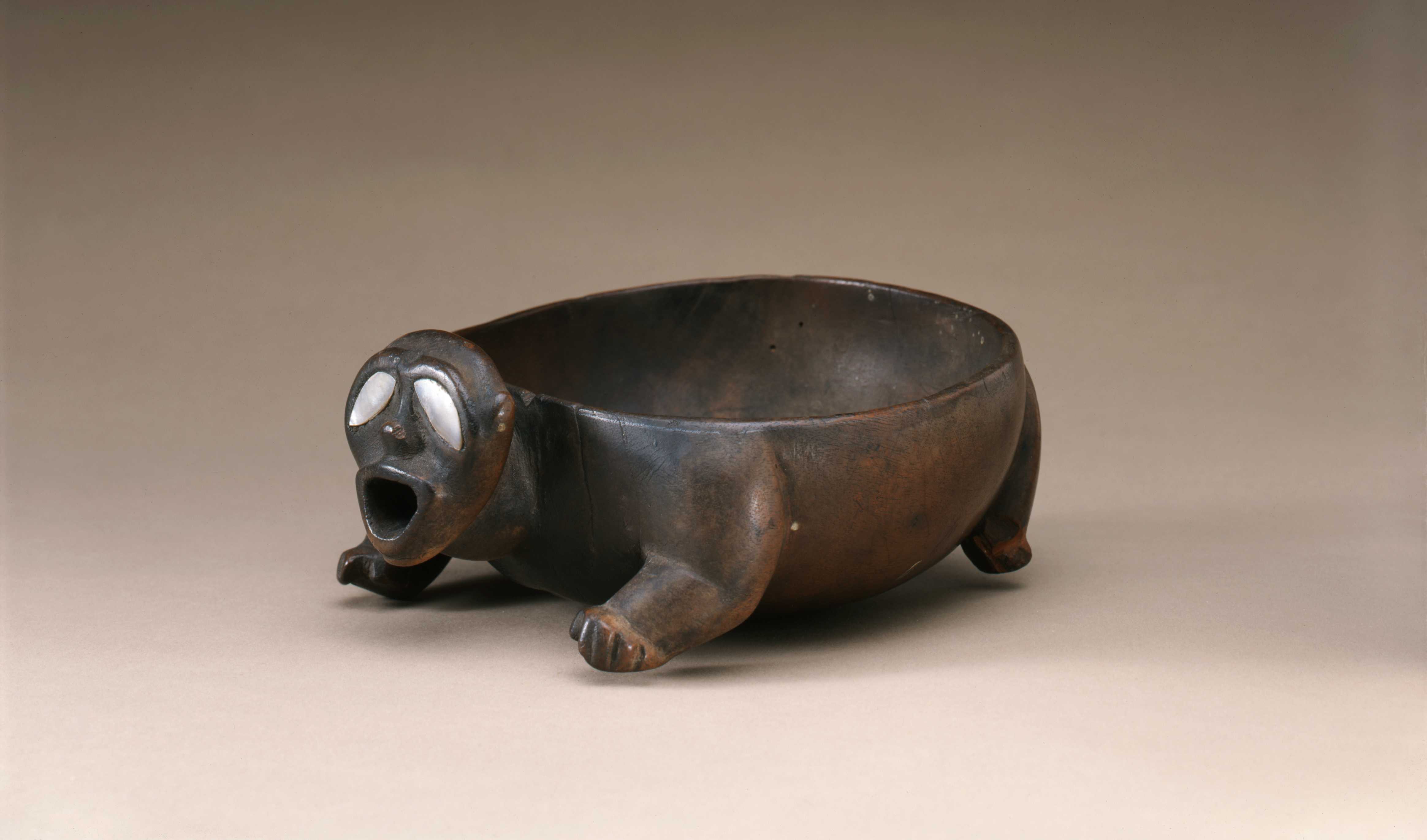Bol, Hawaii, XVIIIe siècle. Bois et nacre. L. : 18,5 cm. Collecté lors du troisième voyage de Cook (1776-1780). © Acquis en 1922 de la Widdicombe House Collection ; ex-coll. du Leverian Museum, vente de 1806 ; Museum of Archaeology and Anthropolgy University of Cambridge. Inv. Nr. 1922.916.