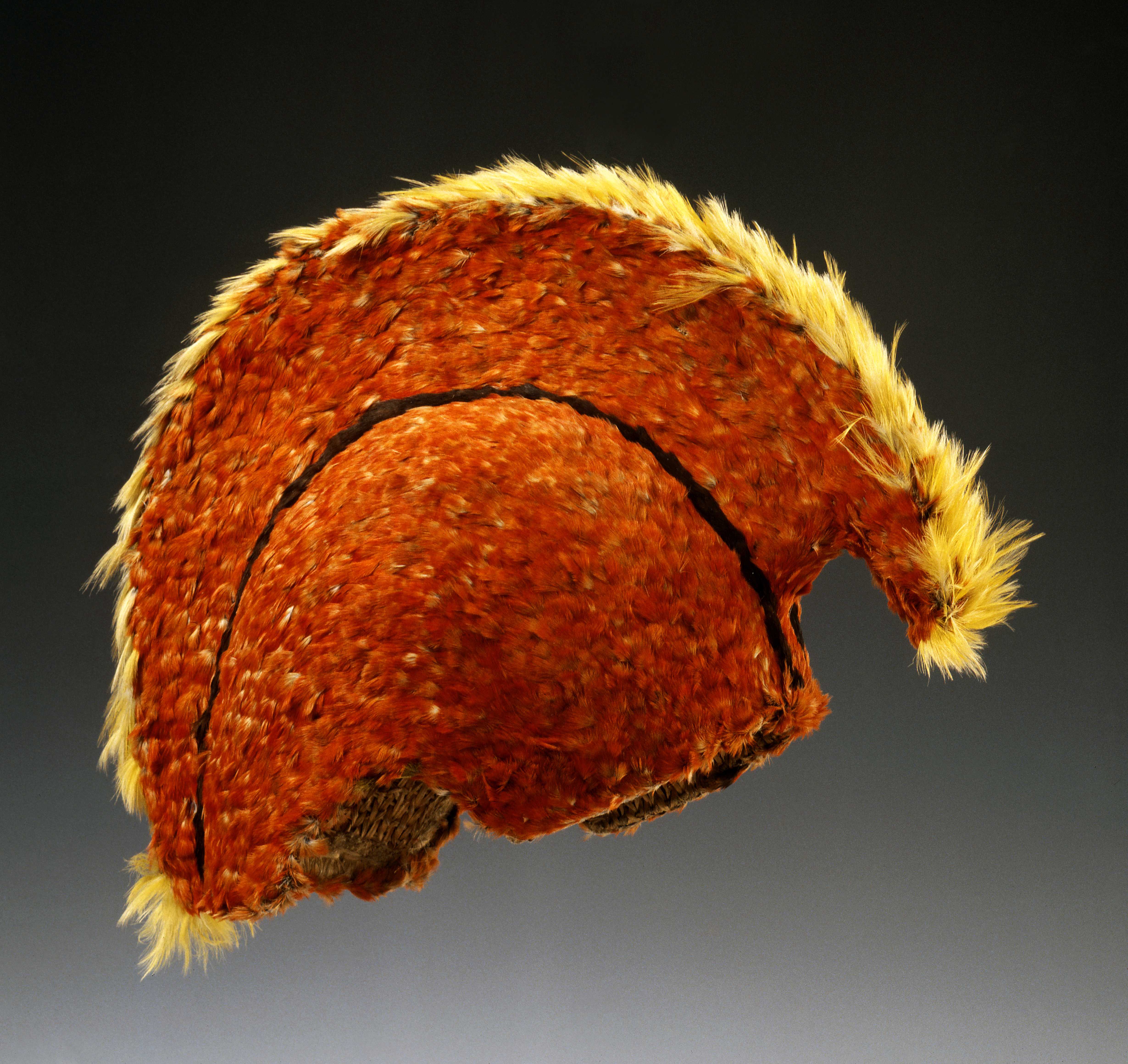 Casque (mahiole), Hawaii, XVIIIe siècle. Les casques collectés par Cook lors de son troisième voyage (1776-1780) présentent chacun une crête différente. Racines aériennes d’’ie’ie (Freycinetia arborea), plumes et fibres. H. : 61 cm. Ex-coll. Cook/Forster (1776-1780). © Ethnologische Sammlung der Universität Göttingen. Inv. Oz 2457. Photo : Harry Haase.