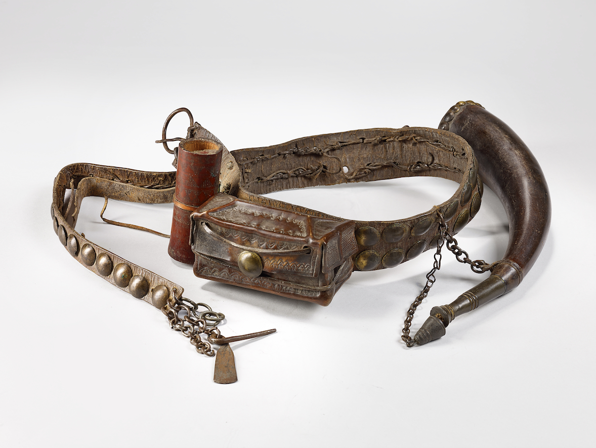 Ceinture de guerrier, parure protectrice, Madagascar, avant 1891. Cuir de bovidé, fer, clous en cuivre, bambou, corne et bois. Dim. : 8 x 36 x 27 cm. Don Louis Catat (mission 1889-1890). © Musée du quai Branly-Jacques Chirac. Photo Claude Germain. Inv. 71.1891.45.64.
