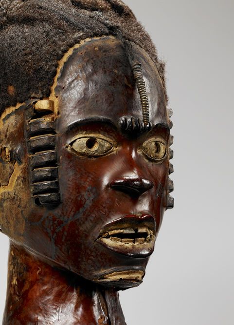 Cimier de danse anthropomorphe (détail), région de la Cross River. Nigéria. Avant 1996. Bois, peau d’antilope, métal et cheveux. H. : 35 cm. Ex-coll. Barbier-Mueller. © Musée du quai Branly-Jacques Chirac. Inv. 73.1996.1.18. Photo Claude Germain.