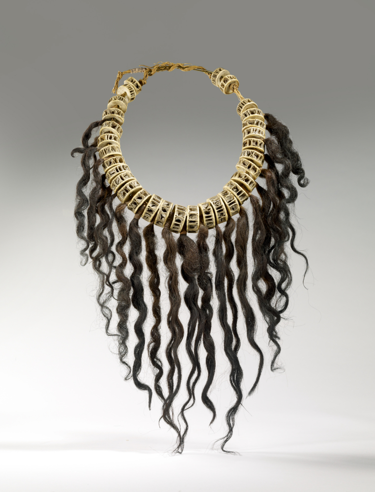 Collier, îles Marquises. Fin du XIXe siècle. Os de poisson ? (vertèbres de requin), cheveux, fibres végétales et métal. Dim. : 54 x 28 x 4 cm. © Musée du quai Branly-Jacques Chirac. Inv. 71.1898.63.3 D. Photo Claude Germain.