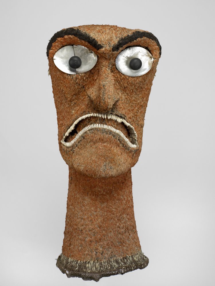 Tête emplumée (ki’i hulu manu), Hawaii, fin du XVIIIe siècle. Bois, cheveux humains, nacre, dents de chien, plumes d’oiseau et vannerie. H. : 81 cm. © Londres, Trustees of the British Museum. Inv. Oc,HAW.80.
