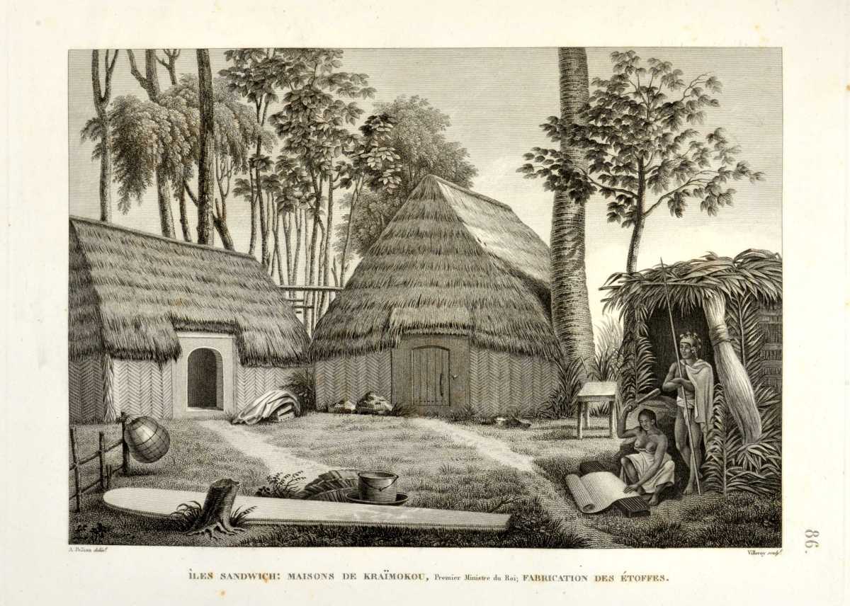 Alphonse Pellion (1795-1815), « Îles Sandwich : Maisons de Kraïmokou, Premier Ministre du Roi ; Fabrication des étoffes », gravure, Paris, 1825. © Coll. privée. Photo : Sharok Shalchi.