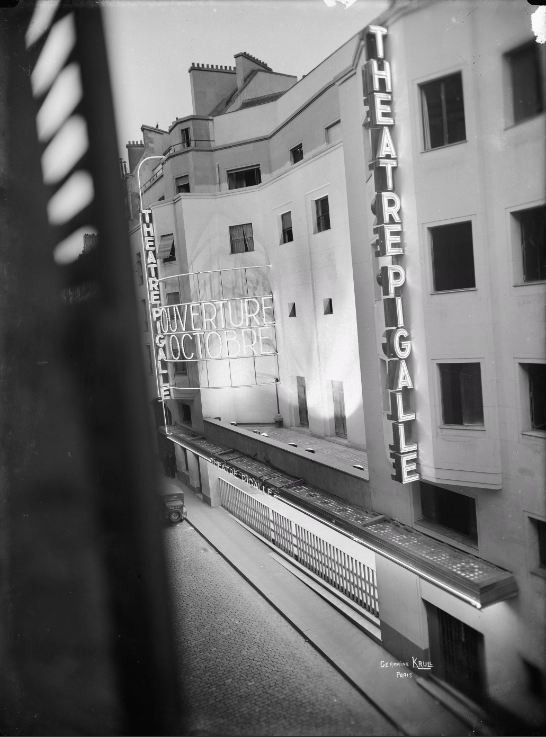 Krull, Germaine (1897-1985), [Paris. Théâtre Pigalle]. Façade extérieure vue de côté, 1929. Négatif sur verre au gélatino-bromure d’argent. Dim. : 18 x 24 cm. © BHVP/Parisienne de photographie/Estate Germaine Krull, Museum Folkwang, Essen.