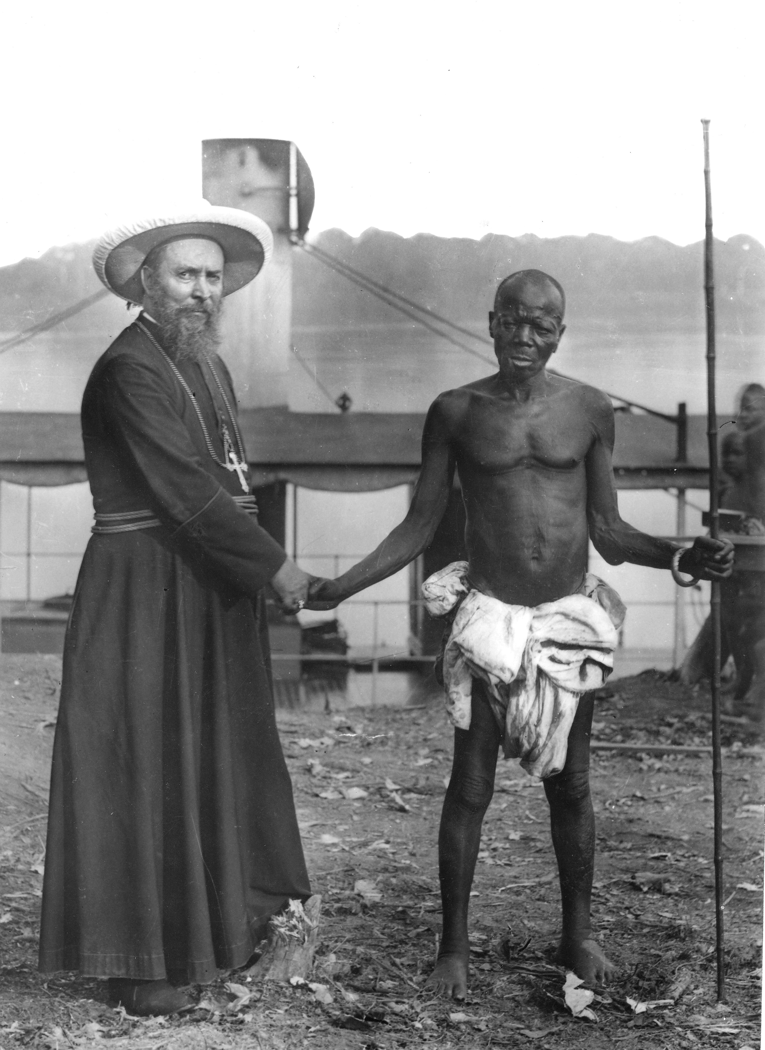 Mgr Prosper Augouard (1852-1921) avec le chef Bétou faisant le « pacte de sang », Oubangui, 1892. © Archives de la Congrégation du Saint-Esprit.