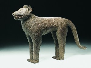 Dans de nombreuses religions, l’ablution constitue un acte rituel de purification par l’eau. Cet usage existe depuis l’Antiquité et est attesté par l’existence de récipients en forme d’animaux ou ornés de représentations humaines. L’aquamanile médiéval occupe une place de choix parmi les objets en bronze réalisés au Moyen Âge. Cette sorte d’aiguière a surtout été produite dans le nord de l’Europe, bien qu’on en connaisse dans le monde islamique. Les aquamaniles européens représentent principalement des animaux mythologiques comme des lions, des dragons, des griffons et des sirènes ou des cavaliers et des personnages tirés de la tradition chrétienne ou de récits allégoriques qui devaient revêtir une fonction symbolique en lien avec le sujet représenté. La plupart des aquamaniles en bronze furent fondus selon la technique de la cire perdue, dans des ateliers en Lorraine, dans la vallée de la Meuse, en Basse-Saxe, dans le Nord de l’Allemagne, en Scandinavie, aux Pays-Bas et même en Angleterre. Au XIIe siècle, la Basse-Saxe connaît dans ce domaine un important développement sous l’impulsion du duc de Saxe, Henri le Lion (1129-1195). Ces récipients avec un bec verseur étaient utilisés pour le lavage des mains, dans un but profane ou liturgique. Cette pratique commune à la sphère religieuse et civile entrait toutefois dans un cadre davantage symbolique qu’hygiénique. Objet classique des cultures allemandes et françaises au Moyen Âge, l’aquamanile semble avoir disparu à la fin du XIVe siècle, près d’un siècle avant la découverte du Bénin. On ne sait pas si ce thème arriva à franchir le Sahara ou si les aquamaniles du Bénin s’inspirèrent de ceux du Proche-Orient. Plus probablement son usage fût importé par les voyageurs Portugais qui apportèrent en Afrique un ou plusieurs exemplaires de ce qui était déjà en Europe une antiquité. Les africains l’interprétèrent alors avec leur propre symbolique. Cet élégant aquamanile naturaliste datant du XVIIe siècle est en forme de léopard à l’expression pleine de vigueur, debout, à l’arrêt, la queue étendue. La tête est creusée d’un orifice servant au remplissage, surmonté d’un couvercle à charnière, les narines faisant office de becs verseurs. Le corps de l’animal est recouvert d’un décor en relief simulant le pelage du félin. Ces objets formaient vraisemblablement des paires et étaient conservés sur les autels royaux ancestraux. Les grandes cérémonies du royaume avaient lieu toute l’année et il des ablutions rituelles étaient pratiquées à ces différentes occasions, en particulier lors de l’Ugie Erha Oba, organisée par l’oba (roi) en l’honneur de son père. La tradition voulait également que le notable qui rendait visite à l’oba se lave les mains dans un plat où l’on versait l’eau d’un aquamanile. L’iconographie béninoise foisonne de références au félin, animal emblématique de l’oba qui faisait l’objet de nombreuses métaphores royales. Il existait une guilde des chasseurs de léopards. Certains étaient sacrifiés, d’autres étaient apprivoisés et accompagnaient l’oba dans les processions comme symboles de son pouvoir sur le roi des forêts.