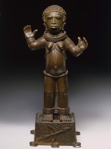 Figure féminine qui représenterait la déesse Irhevbu ou la princesse Edeleyo, XVIIe ou XVIIIe siècle, royaume du Bénin, Nigéria. Alliage de cuivre. H. : 46,5 cm. © Staatliche Museen zu Berlin – Preußischer Kulturbesitz, Ethnologisches Museum. Photo : Martin Franken.