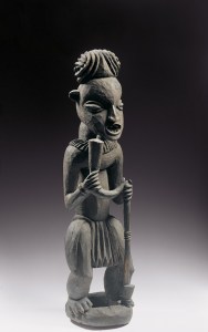 Dans ces rapprochements inattendus figure l’association improbable de deux personnages mythiques : un « Christus im Elend » (“Christ de pitié”, vers 1525) par Hans Leinberger, un des sculpteurs les plus inventifs d’Allemagne du sud (1480-1531) et Chibinda Ilunga (anonyme, Chokwe, Angola, XIXe siècle). Ces deux personnages sont des “héros” dans leurs cultures respectives, mais pourraient difficilement être plus différents. Le sujet du Christ de pitié est connu dans le monde byzantin depuis le XIIe siècle. Lié au cycle de la Passion, il constitue une image de dévotion destinée à la méditation sur la mort du Christ. Dépouillé de ses vêtements, assis sur le rocher du Golgotha que couvre sa tunique, la tête baissée, il porte la couronne d’épines. Son visage est marqué par la souffrance. Il attend le supplice de la crucifixion. De ce Christ, créé dans une période où la vénération d’images était de plus en plus jugée comme de l’idolâtrie, émane une présence mystique. Il est représenté plein de vitalité mais, en même temps, ses épaules larges et musclées portent le fardeau de toute l’humanité dans l’accomplissement de son sacrifice pour le salut du monde. La notion chrétienne de l’héroïsme, liée à la capacité de souffrance et d’acceptation du martyre qui se manifeste dans ces représentations est bien différente de celle de Chibinda Ilunga. Chibinda Ilunga est la figure centrale d’un récit qui mêle légendes et généalogies dynastiques. Né de l’amour entre la reine Lunda Lweji et le chasseur Luba Chibinda, il est considéré comme le fondateur de la dynastie Lunda, en 1600. Comme le Christ, son corps “athlétique” marque bien la stature du héros. Les mains sont larges, démesurées, de même que les pieds, comme pour magnifier la force terrestre de ce personnage hors du commun qui, outre un fusil, un sac à cartouches et un couteau — signes de son statut de chasseur —, porte la coiffure mutwe wa kayanda, celle des souverains chokwe détenteurs des pouvoirs spirituels et politiques.