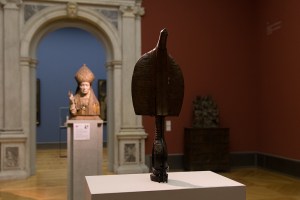 En rapprochant le buste reliquaire d’un saint évêque (anonyme, Bruxelles [?], Belgique, vers 1520) d’un reliquaire mahongwé (anonyme, Gabon, XIXe siècle), l’exposition cherche à saisir, entre deux civilisations lointaines, les similitudes et les différences de comportement de l’homme face au trépas. Les rites funéraires se retrouvent en effet dans toutes les civilisations, divers, mais avec des intentions similaires. Si la mort est en Europe comme en Afrique perçue comme une transition, dans l’art européen, elle est présentée comme un dernier adieu et a pour objectif de remplir un devoir de mémoire alors qu’en Afrique, les défunts restant présents, il s’agit de maintenir un lien entre les vivants et l’au-delà. Différence également entre la relative sobriété des reliquaires en Afrique et la somptuosité, voir le baroquisme de ceux en Europe. Tenues à distance en tant qu’objets sacrés, les reliques sont toujours des signes de richesse et de puissance. Aussi, doivent-elles être montrées ou découvertes au moment de cérémonies importantes dans la vie des communautés. Dans les deux cas, l’auditoire était placé en face d’œuvres d’inspiration religieuse visant à maintenir la présence des ancêtres et magnifiant des ossements humains vénérés. Quel est le statut de ces objets de culte créés pour conjurer et apprivoiser la mort, s’approprier l’énergie et le pouvoir de l’autre, garder la mémoire des défunts et évoquer le mystère de l’existence, devenus objets culturels ? Que dire du sacré ? Peut-on enfermer dans des musées ce que des hommes ont révéré ? Et ne remplace-t-on pas une sacralisation par une autre ? Il s’agit ici de jeter un pont entre différentes croyances et de souligner la manière dont elles ont su utiliser les pouvoirs de l’art pour repousser les frontières de la disparition et de l’effacement. Dans le Moyen Âge Européen, les représentations de la mort dans l’art prennent la forme d’une mort idéalisée. Le culte des reliques prend une grande importance, tout particulièrement dans l’Europe catholique. Bénissant de sa main droite gantée, ce saint évêqueest coiffé de sa mitre épiscopale à deux fanons, symbole de son autorité magistrale et de sa fonction d’enseignement. Il porte une chasuble recouverte d’une chape dorée retenue sur la poitrine par un fermoir formant cavité à reliques exposant un morceau de côte protégé par une vitre en cristal de roche, entourée d’une guirlande de cabochons. Sa tête, étonnamment réaliste, renferme un fragment de crâne.