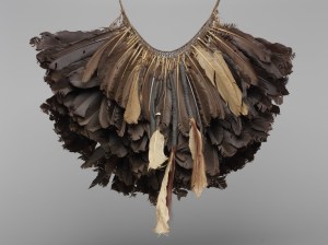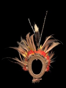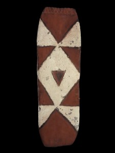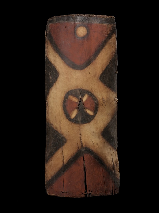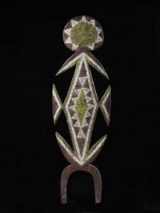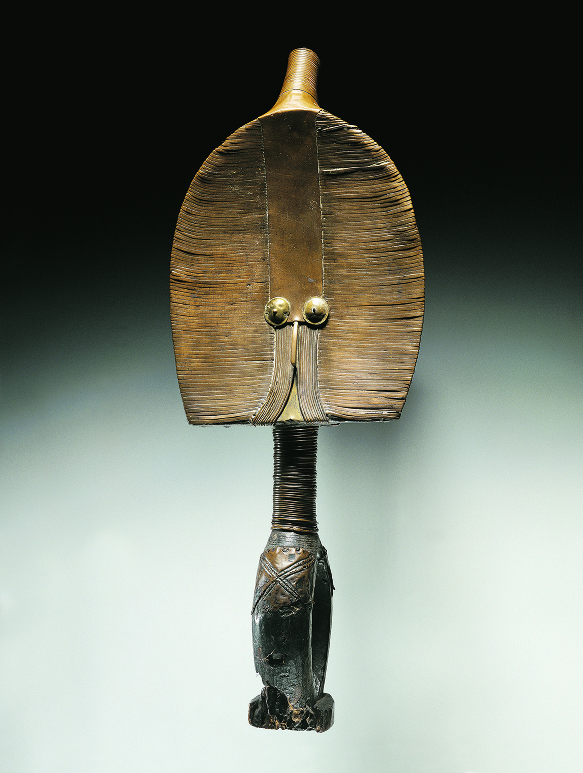 En Afrique, les Mahongwé, comme tous les groupes composant le peuple Kota, avaient pour habitude de conserver les ossements des ancêtres du lignage auxquels était rendu un culte connu sous le nom de bwété (ou bwiti). Ils étaient également consultés en cas de problème et au cours de rituels initiatiques afin de repousser les forces invisibles néfastes susceptibles d’amoindrir le pouvoir surnaturel protecteur des ancêtres. L’ensemble des reliques — calottes crâniennes et autres ossements — était conservé dans un panier en écorce ou en osier sur lequel l’effigie, intermédiaire entre les vivants et les morts,était dressée. Constituée d’une âme en bois plaquée de lamelles et de plaques de cuivre ou de laiton dont l’agencement figure une représentation humaine, la partie inférieure prend la forme d’une poignée orientée perpendiculairement au plan du visage.C’est ainsi que, malgré l’emploi de techniques et de matériaux variés, les différents types de dispositifs entourant les reliques créent des résonances entre les cultures et expriment les pouvoirs invisibles et intangibles des saints et des ancêtres en termes visuels.