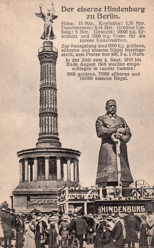 La statue mesurant près de treize mètres de haut, dressée en 1915 au centre de Berlin, près de la Siegessäule (Colonne de la victoire), représente probablement la plus fameuse manifestation visuelle du culte voué à Hindenburg. Pesant six tonnes, elle fut réalisée, sous la direction du peintre Georg Marschall (1871-1956), à partir de bois d’aulne et de clous, par plus de quatre-vingts sculpteurs, en seulement six semaines. Photographe inconnu.