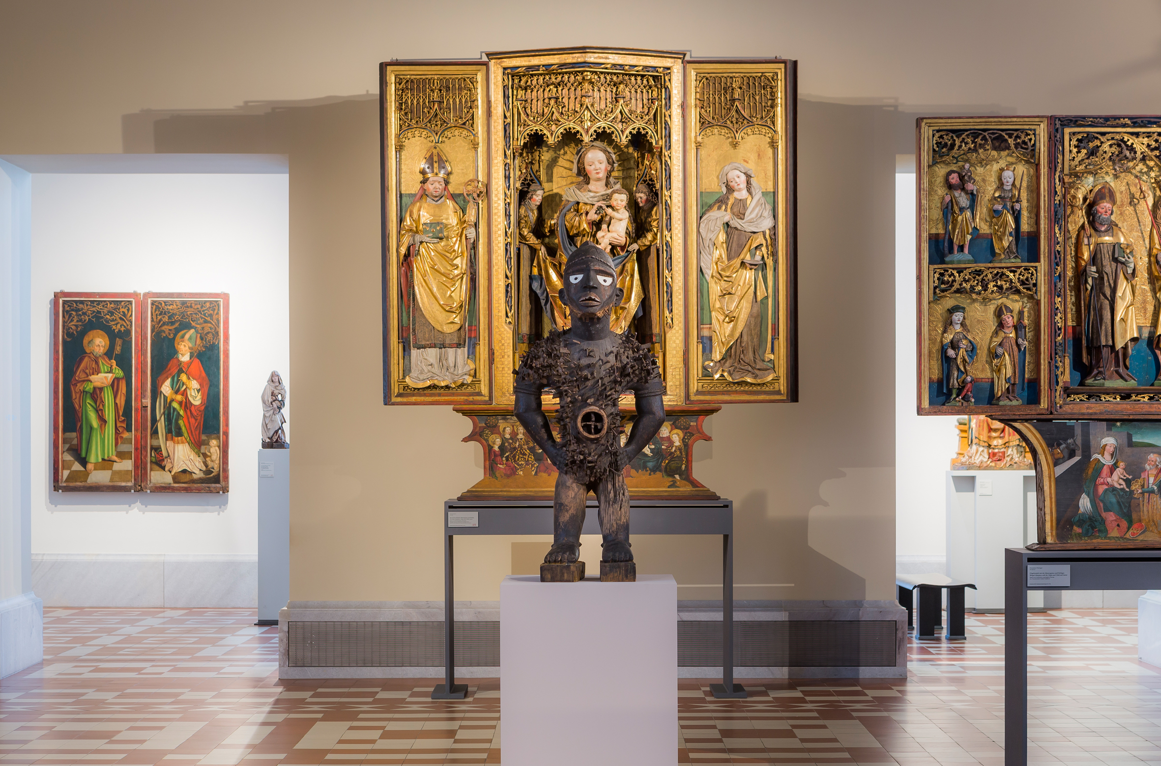 « Incomparable : l’art d’Afrique au musée Bode » : Fétiche à clous mangaaka, Yombe, République démocratique du Congo ou Cabinda, Angola, XIXe siècle, devant le retable de la Vierge, Zamser, Tyrol, Autriche, vers 1485. © Staatliche Museen zu Berlin. Photo : David von Becker.