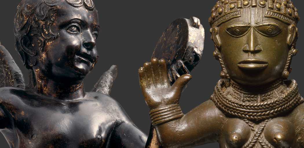 Ces face-à-face subjectifs débutent avec deux sculptures en métal, le putto au tambourin (1428-1429) par le florentin Donatello (1383 ou 1386-1466) et la figure féminine qui représenterait Irhevbu ou la princesse Edeleyo (anonyme, Royaume du Bénin, XVIIe-XVIIIe siècle).Cette dernière, bien que stylistiquement inhabituelle, révèle une conception du corps, du visage, de la coiffure et des bijoux qui suit une stricte symétrie, atténuée par les bras tenus à différentes hauteurs. L’arc et la flèche figurant sur le socle sont les insignes d’Ake, chasseur et tireur d’élite, héros national hissé au rang de dieu et patron des tireurs à l’arc. La jeune fille nue représenterait dès lors Irhevbu, l’épouse bien-aimée de ce dieu qui, après sa mort, fut à son tour hissée au rang de déesse. Une autre interprétation possible est que cette figurine incarnerait Edeleyo, la fille aînée d’Ewuare (XVe siècle),qui aurait dû succéder à son frère, tué d’une flèche empoisonnée en plein front, mais qui mourut avant même d’avoir pu être intronisée. L’arc et la flèche ornant le piédestal de la statue rappellerait peut-être cet épisode.Témoignages de l’habileté de leurs créateurs — bien qu’un seul des deux artistes soit connu —, ni l’une ni l’autre n’ont été conçues comme des œuvres d’art solitaires. Le putto faisait partie d’un groupe de cinq décorant les fonts baptismaux du baptistère San Giovanni de la cathédrale de Sienne, alors que la déesse fut probablement créée pour orner l’autel commémoratif d’un oba (roi). Toutes deux ont été fondues dans des matériaux considérés à l’époque comme étant de grande valeur — bronze et alliage de cuivre — et ont servi à des fins religieuses et/ou rituelles. Les deux ont été acquises au début du XXe siècle et, malgré l’intérêt incontestable qu’elles représentaient aux yeux de leurs commanditaires respectifs, l’accueil qui leur fut réservé dans les collections allemandes fut bien différent. Tandis que la pièce de Donatello rejoignait d’autres fameux sculpteurs de la Renaissance tels que Pisano ou Luca della Robbia au Kaiser-Friedrich-Museum, la pièce du Bénin fut reléguée en tant que spécimen au musée ethnographique. À l’époque de l’impérialisme, l’Europe concevait « les autres » comme des vestiges du passé. Et, tandis que l’art occidental était interprété comme “évolutif”, l’art africain était considéré comme “statique” ou “traditionnel”.