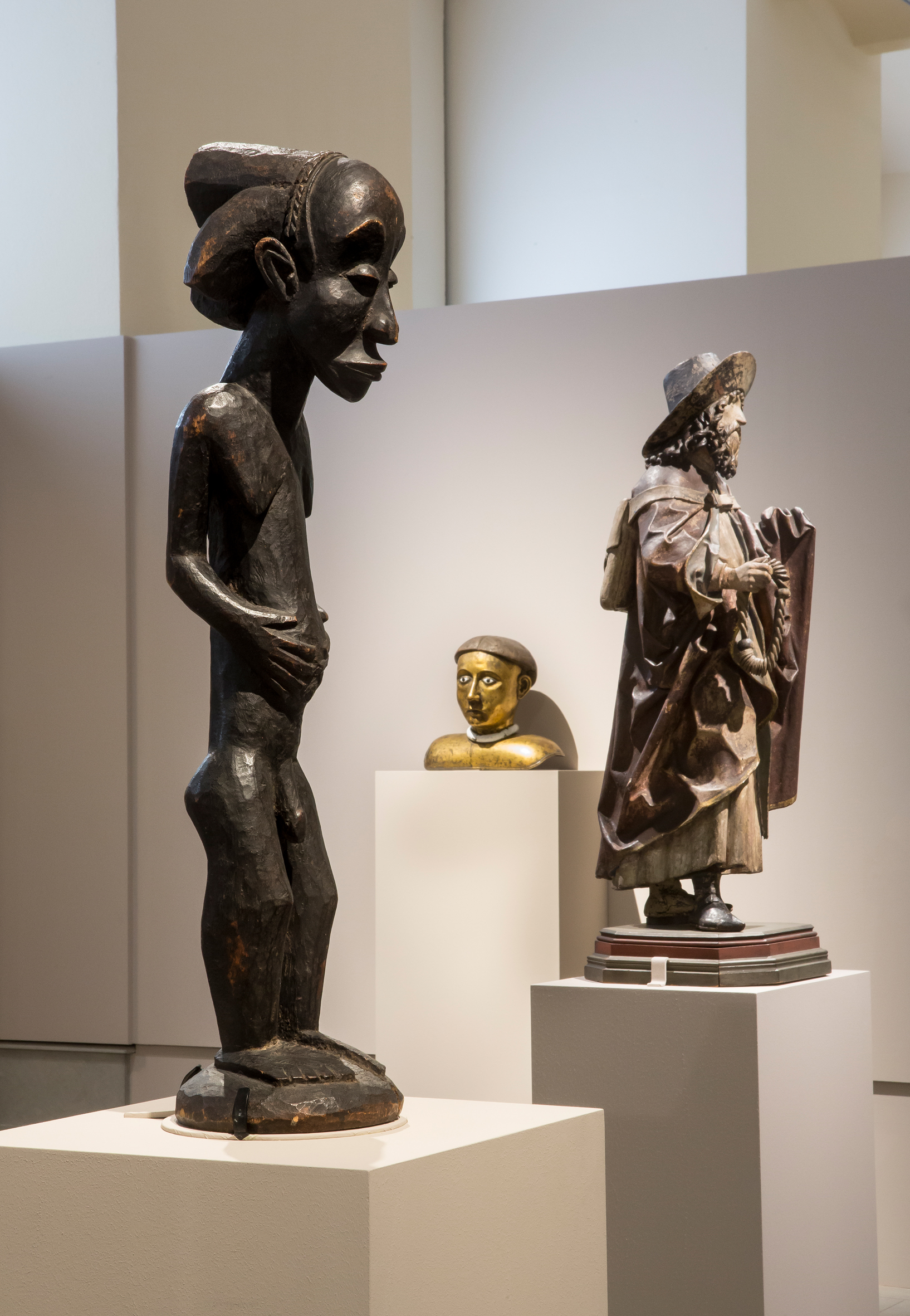 Dans ces rapprochements inattendus figure l’association improbable de deux personnages mythiques : un « Christus im Elend » (“Christ de pitié”, vers 1525) par Hans Leinberger, un des sculpteurs les plus inventifs d’Allemagne du sud (1480-1531) et Chibinda Ilunga (anonyme, Chokwe, Angola, XIXe siècle). Ces deux personnages sont des “héros” dans leurs cultures respectives, mais pourraient difficilement être plus différents. Le sujet du Christ de pitié est connu dans le monde byzantin depuis le XIIe siècle. Lié au cycle de la Passion, il constitue une image de dévotion destinée à la méditation sur la mort du Christ. Dépouillé de ses vêtements, assis sur le rocher du Golgotha que couvre sa tunique, la tête baissée, il porte la couronne d’épines. Son visage est marqué par la souffrance. Il attend le supplice de la crucifixion. De ce Christ, créé dans une période où la vénération d’images était de plus en plus jugée comme de l’idolâtrie, émane une présence mystique. Il est représenté plein de vitalité mais, en même temps, ses épaules larges et musclées portent le fardeau de toute l’humanité dans l’accomplissement de son sacrifice pour le salut du monde. La notion chrétienne de l’héroïsme, liée à la capacité de souffrance et d’acceptation du martyre qui se manifeste dans ces représentations est bien différente de celle de Chibinda Ilunga. Chibinda Ilunga est la figure centrale d’un récit qui mêle légendes et généalogies dynastiques. Né de l’amour entre la reine Lunda Lweji et le chasseur Luba Chibinda, il est considéré comme le fondateur de la dynastie Lunda, en 1600. Comme le Christ, son corps “athlétique” marque bien la stature du héros. Les mains sont larges, démesurées, de même que les pieds, comme pour magnifier la force terrestre de ce personnage hors du commun qui, outre un fusil, un sac à cartouches et un couteau — signes de son statut de chasseur —, porte la coiffure mutwe wa kayanda, celle des souverains chokwe détenteurs des pouvoirs spirituels et politiques.
