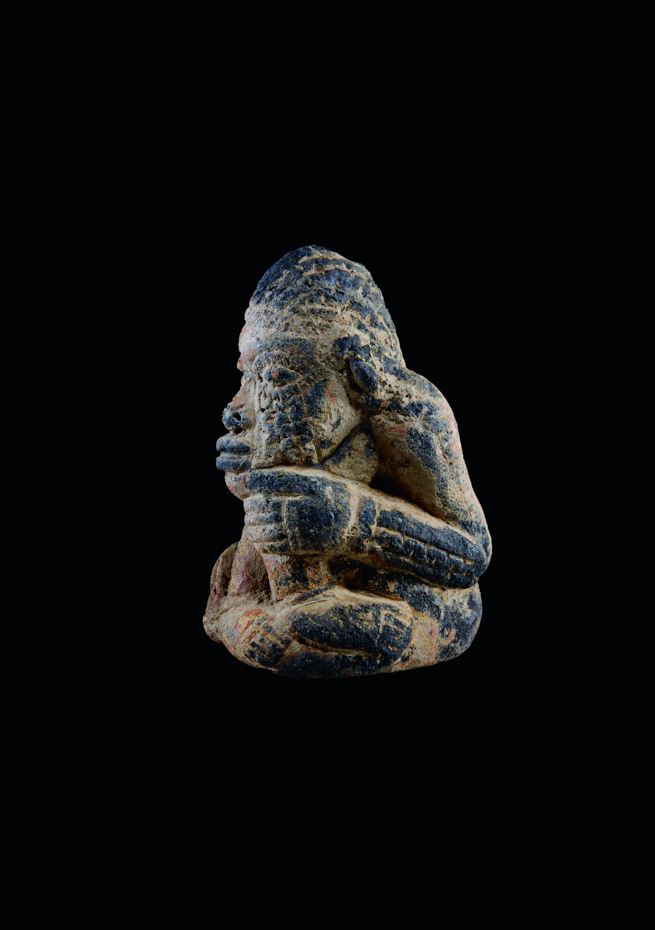 Statuette en calcaire dénommée « Adolescent de Cumpich » représentant un chaman nu, arborant un appareil génital démesuré, probablement en érection, représenté au cours de l’une de ses pratiques ascétiques, Cumpich, Campeche, Mexique. Classique récent (600-800 ap. J.-C.). © Museo Nacional de Antropología, Mexico. Réf. : Maya-NCH-8305. Photo : I. Guevara.