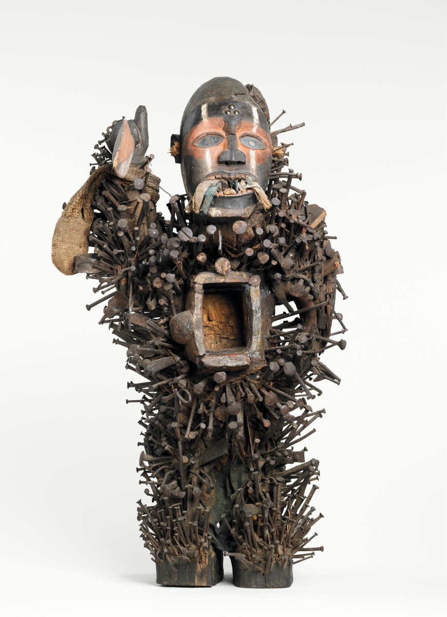Statuette magique nkisi nkondi, Vili, Loango, République Démocratique du Congo. Bois, métal, verre, textile, fibres végétales, pigments, résine, matières organiques. H. : 63,5 cm. Collectée par Joseph Cholet en 1982. © Paris, Musée du Quai Branly-Jacques Chirac. RMN-Grand Palais. Photo Michel Urtado/Thierry Olivier.