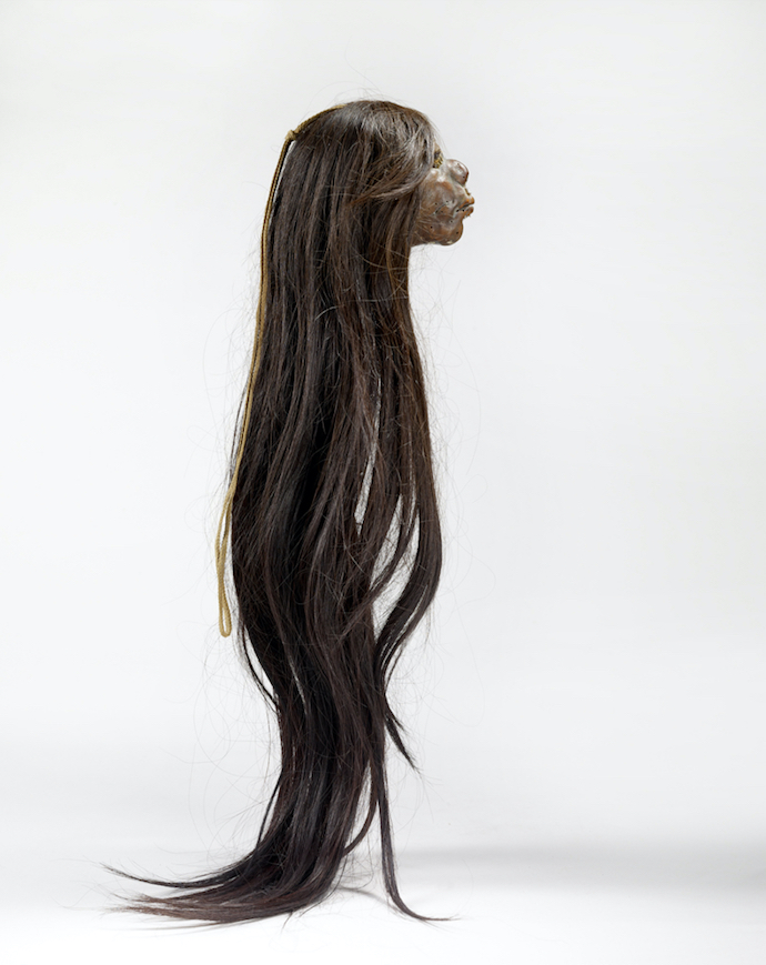 Tête réduite semblant appartenir à une personne de sexe masculin, Shuar, Jivaro, Macas, Équateur. Restes humains, cheveux et fibres. H. 61 cm. © Musée du quai Branly-Jacques Chirac. Inv. 71.2012.0.1437. Photo Claude Germain.